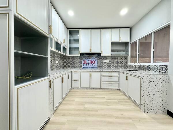 A trendy white European-inspired wood design that comes with classy gold handles and white aluminium doors.